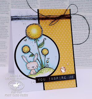 A close up showing the Glamour Dust in the background. The sentiment is from a Waltzingmouse set die cut using Dienamics Stitched Banners.