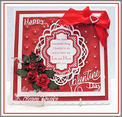 The main card is a 7" square and I've used Creative Expressions Noble Ornate Pierced Squares to make up all the background mats and layers. The number is a Memory Box die which was raised from the main card by a piece of acetate bowed over the top layer so it wouldn't get lost in the white and silver behind it. The flowers are Heartfelt Creations Poinsettia stamps and dies using snow paper. Pins, pearls, leaves etc are all from my stash.
