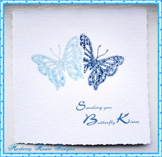 Think I've just got this in by the skin of my teeth this week........... the challenge over at Less is More is a sketch. For this quick card I die cut an aperture out of paper using Nesties so I could mask off the rest of my card. I then inked the edges with Distress Inks and stamped the butterfly image from my Stampin Up set "A touch of Nature" using brown Versafine ink. I then cut out a mask for the butterfly so I could stamp the large SU French text background stamp over the butterfly. I inked two borders using the same Distress Inks (which are straight but look a bit wonky from taking the photo at an angle) and then stamped the sentiment which was from the same stamp set. The two punched butterflies are from my new EK Success 3 butterfly punch and were inked before being adhered to the card.Thanks for looking.